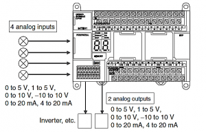 • کلاس های X و XA دارای 40 ورودی و خروجی نرمال (N) و کلاس Y دارای 20 ورودی و خروجی نرمال(N) می باشند. کلاس Y علاوه بر ورودی و خروجی های نرمال دارای 2 ورودی اختصاصی (D) جهت High Speed Counter و همچنین 2 خروجی اختصاصی(D) جهت Pulse Output می باشد. در مدل های با تغذیه از نوع AC خروجی از نوع رله­ای می­باشد. فقط مدل­های با خروجی از نوع ترانزیستوری دارای خروجی پالس(Dedicated or Normal) می­باشند. در مدل­های ورژن 1 و پایــیــنتر (Version1&Earlier) در کلاس X و XA پی ال سی دارای دو ورودی   High Speed Counter 100Khz,  و دو ورودی دیگر 30Khz  می­باشد. کلاس XA علاوه بر دارا بودن امکانات کلاس X دارای 4 ورودی آنالوگ (A/D) و 2 خروجی آنالوگ (D/A) در محدوده­های ولتاژی و جریانی استاندارد زیر  بر روی پی ال سی می­باشد.