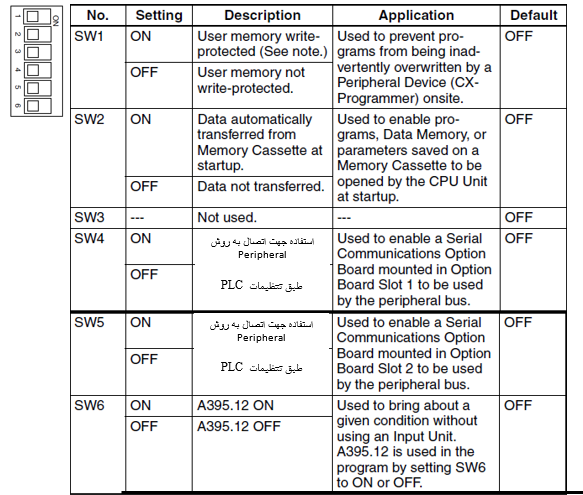 با چرخاندن این پیچ به کمک یک پیچ گوشتی مقدار متغیر موجود در فضای Auxiliary Area  (A642)  بین مقادیر 0-255  تغییر می­کند. از این امکان می­توان در کاربردها  و تنظیماتی که به دقت زیادی نیاز ندارند، جهت تنظیم مقدارSV ها، مانند تایمرها و کانترها بدون وسایل برنامه­ریزی استفاده نمود. در طی مدت تغییر این متغیر، مقدار آن مدام بر روی 7-Seg نشان داده می­شود.